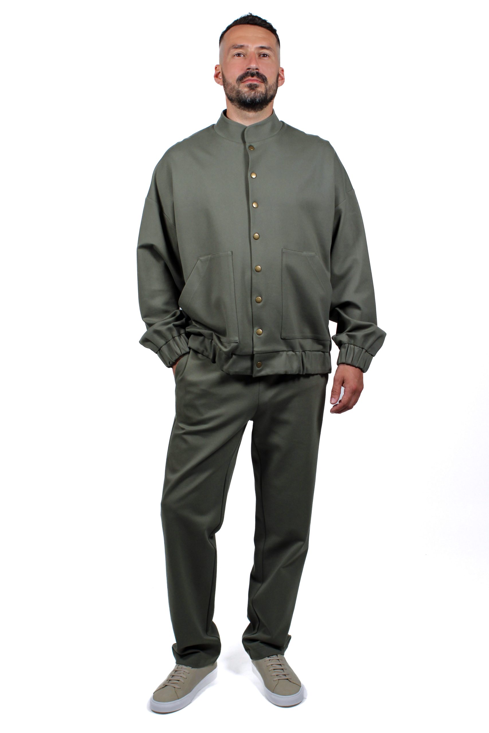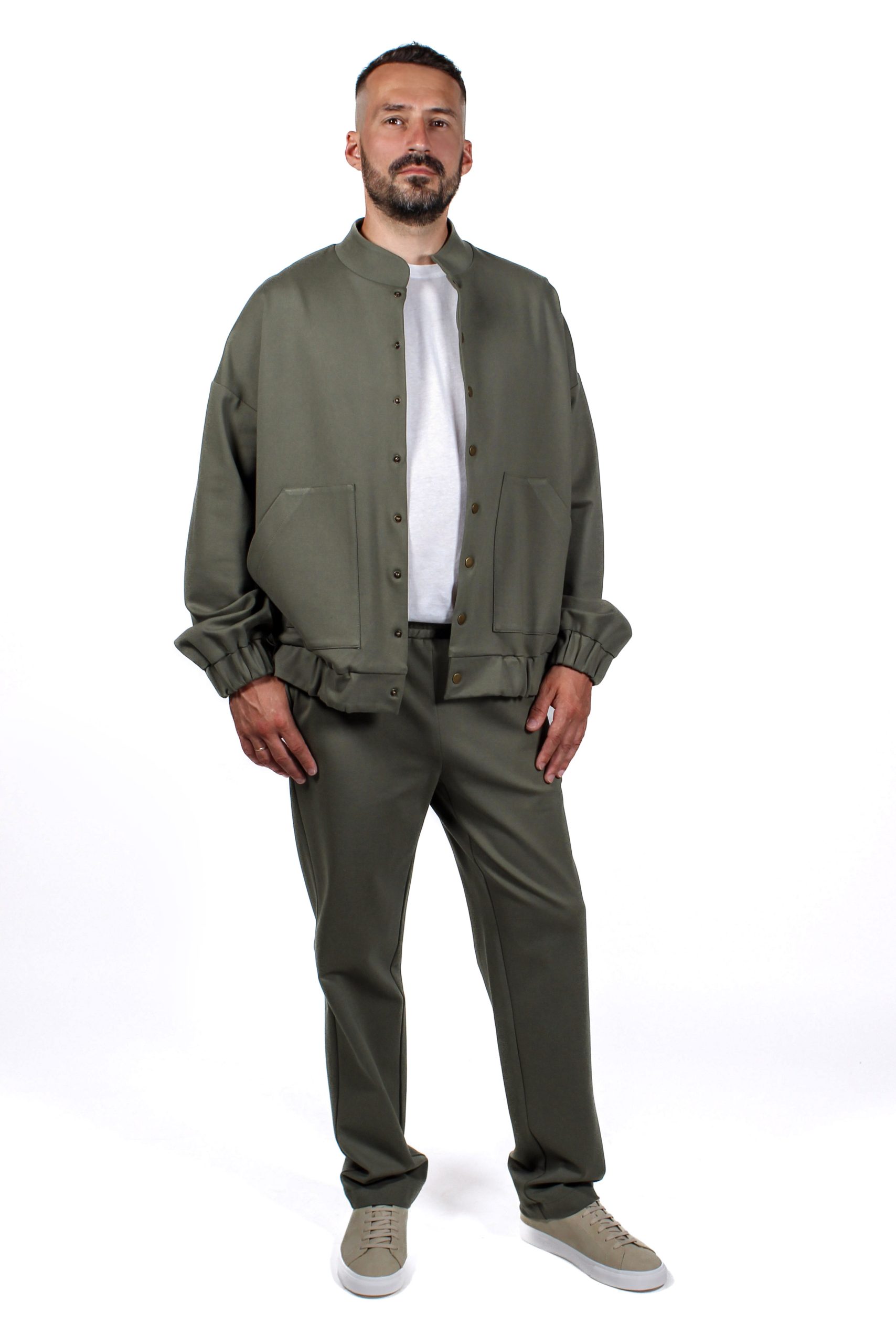 Two-piece set with bomber and trousers in a soft cotton-blend weave. The bomber features a modern stand collar, snap-button closure, and roomy front patch pockets. Dropped shoulders and elasticated cuffs and hem add a casual, contemporary finish. The coordinated trousers are cut in a relaxed fit through the hips and thighs, gently tapering toward the ankle. Designed with an elasticated waistband for all-day comfort and finished with functional side pockets.