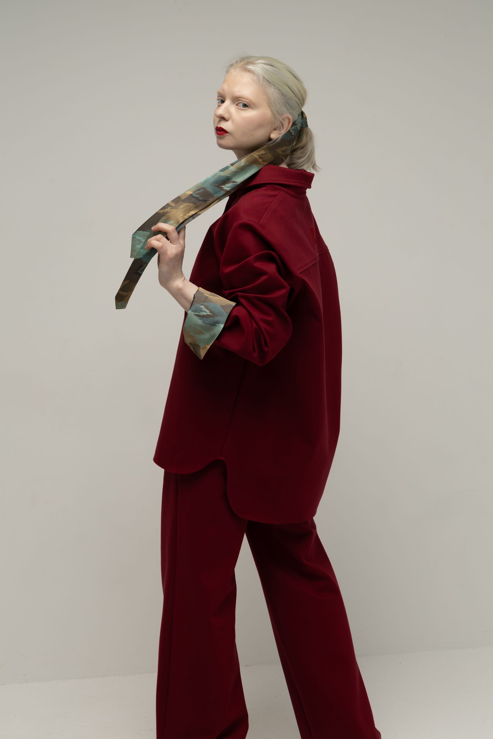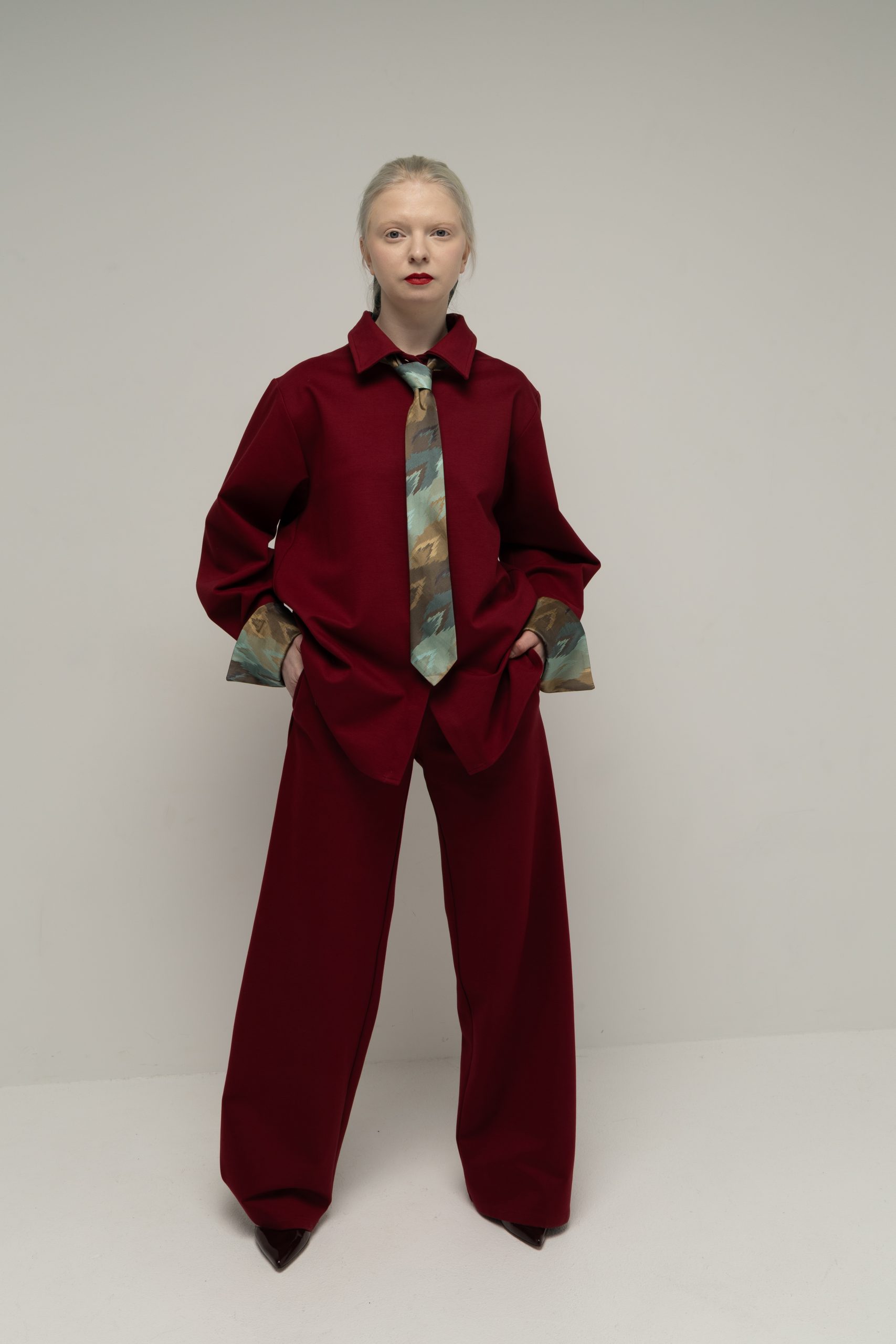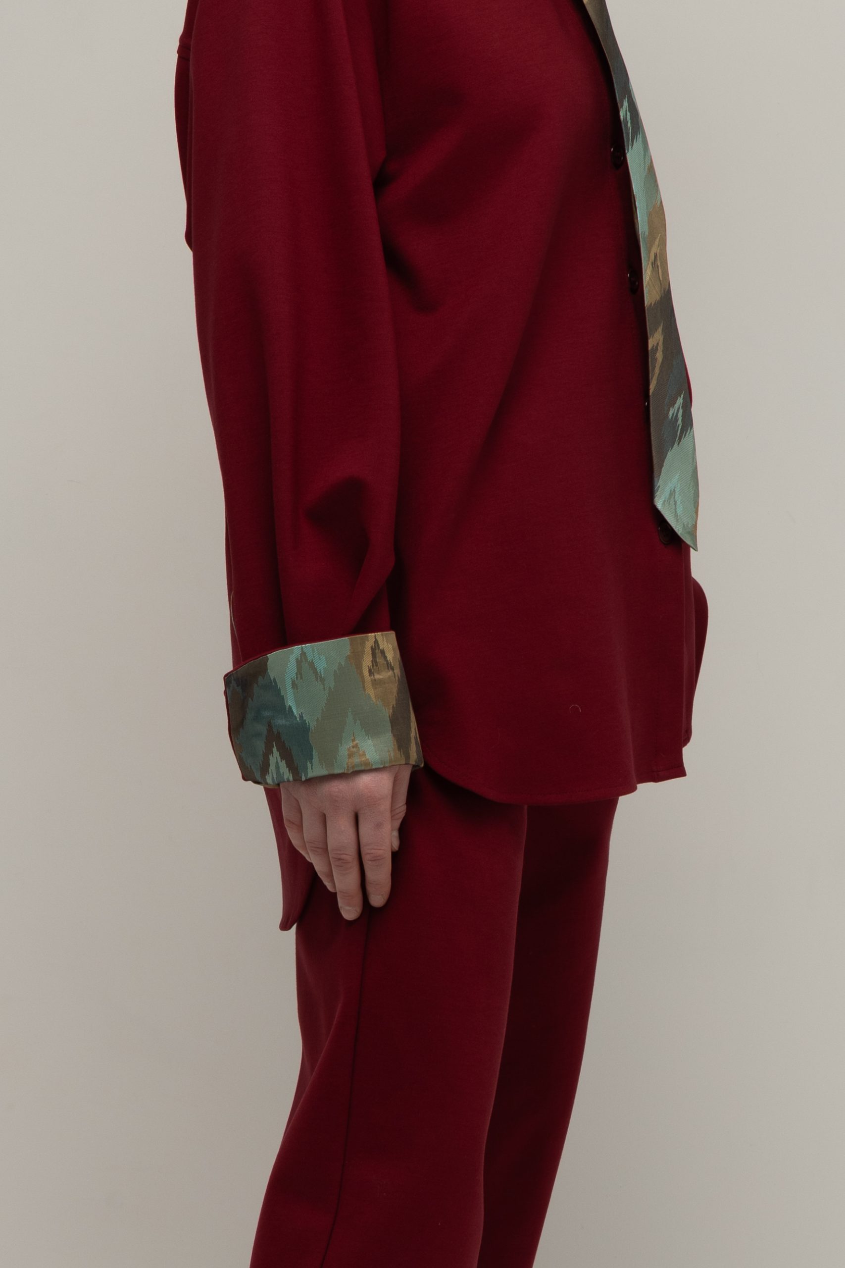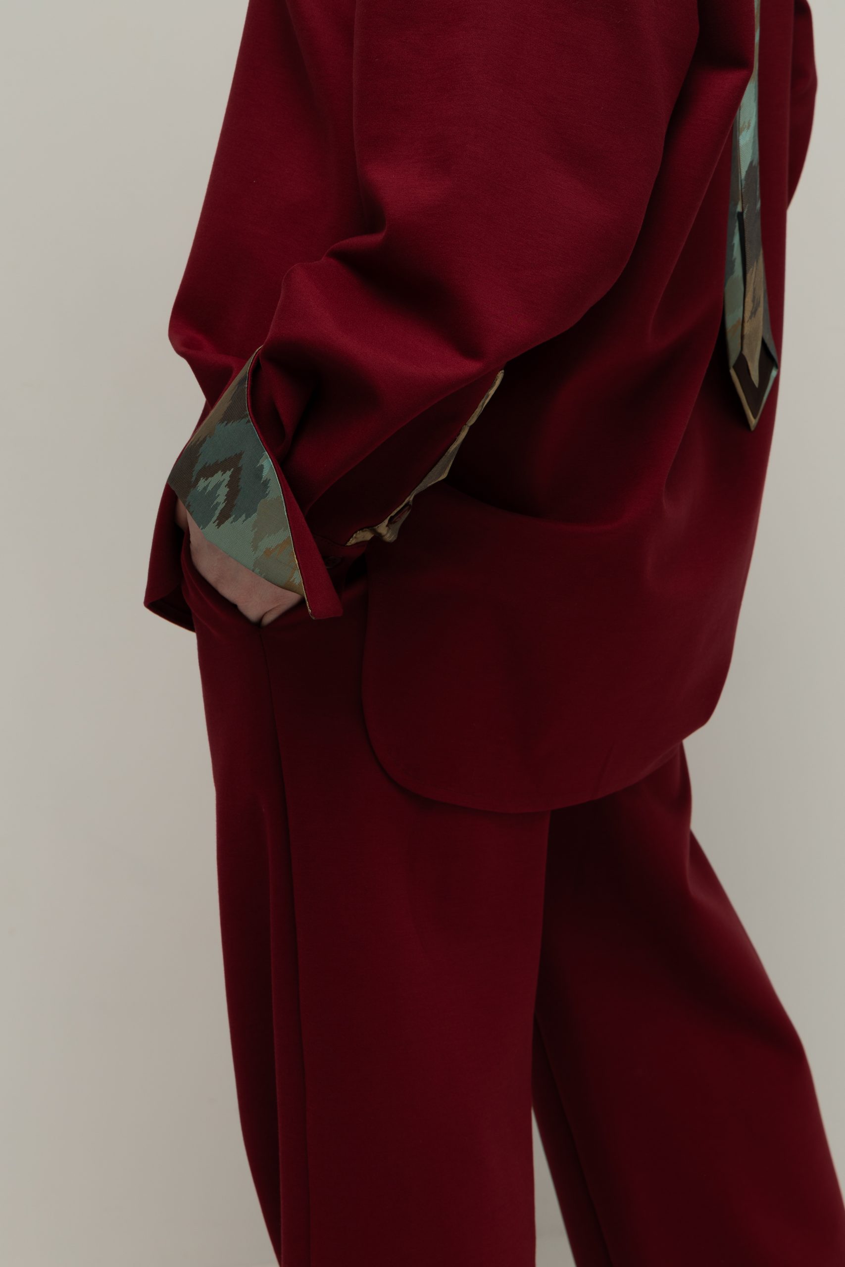 Burgundy cotton  set is  a great choice for any season. Its breathability, comfort, and lightweight nature make it ideal for warm or chill weather. Oversize shirt made from a soft  and compact stretch knit cotton.Featuring a lapel collar and long sleeves finished in a drop-shoulder cuff with an exclusive ikat pattern and embroidered logo on the back. Button-up front. Wide-leg trousers offer a comfortable fit through the hips and thighs. Elasticated waistband for easy wear, complemented by a diagonal front pockets.