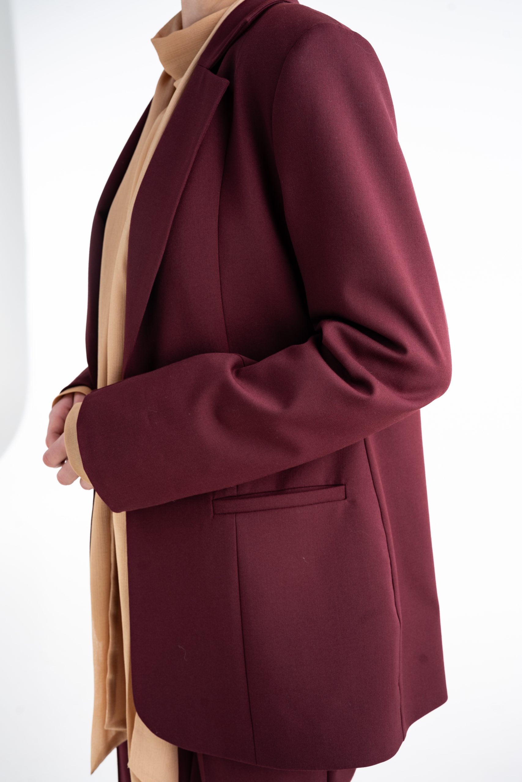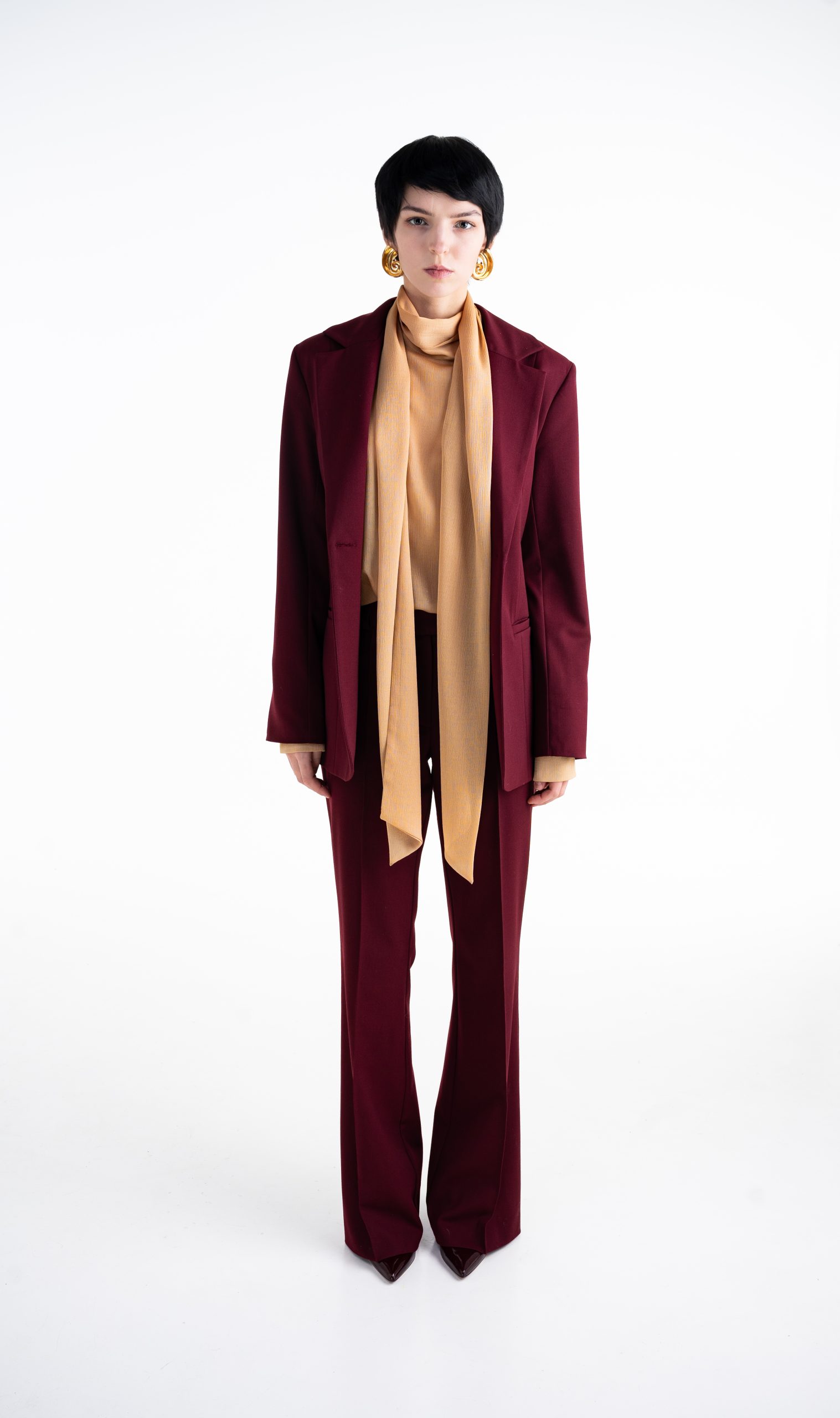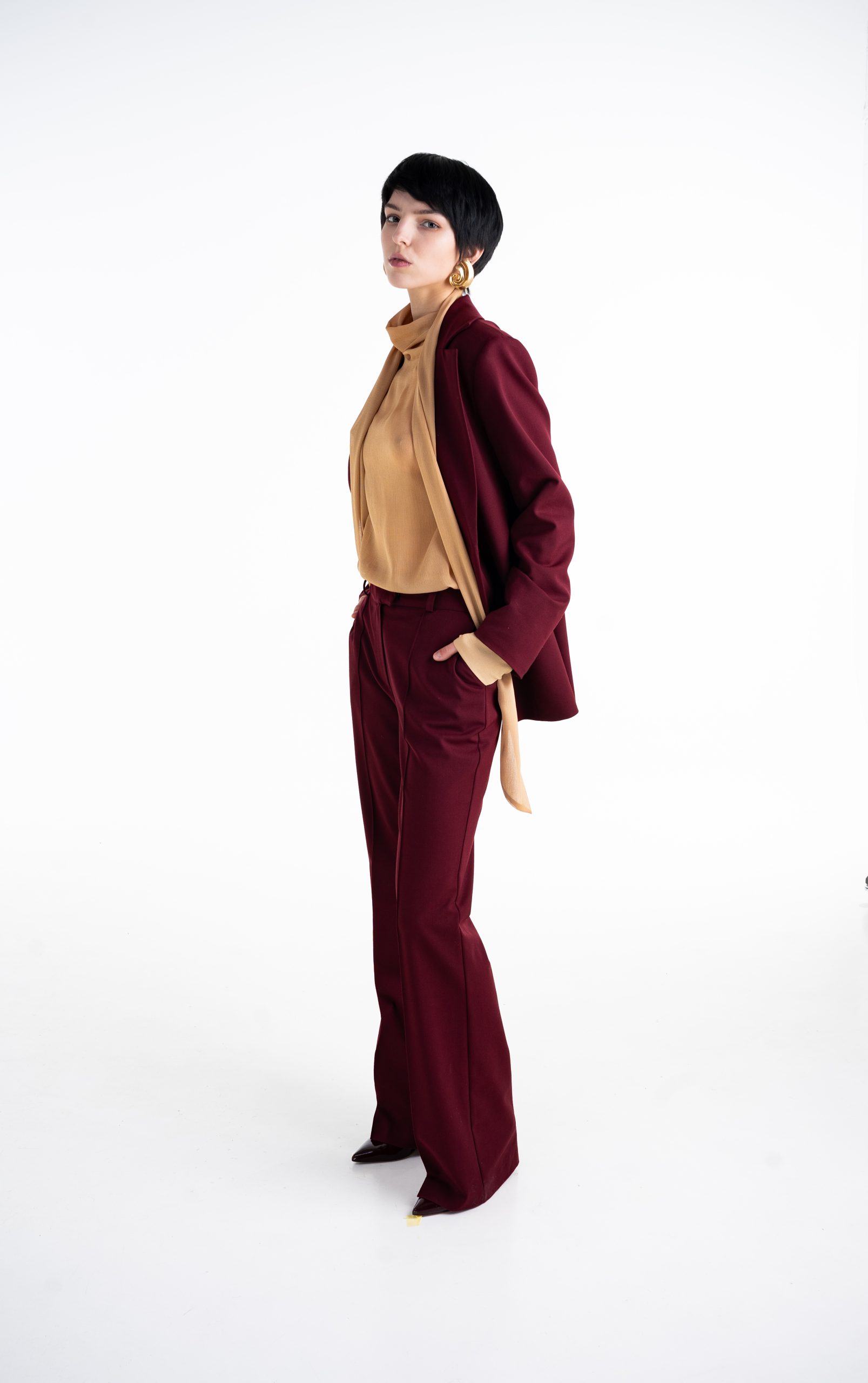 Oversize blazer in a wool blend yarn, long sleeves with  buttoned cuffs, flap patch pockets at the hip and a button-up front. Trousers made in a wool-blend yarn. High waist and waistband with belt loops. Side pockets. Contrasting inner waistband detail with topstitching. Front fastening with zip, inner button and metal hook-and-eye closure. Upgrade your wardrobe with statement pieces in  trendiest hue-burgundy.